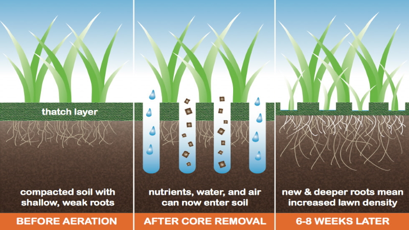 The so-called aeration is a lawn treatment that pulls out ‘’cores’’ or small plugs of grass and topsoil to create a small hole. Thanks to this hole, your lawn will absorb more nutrients and water, not to mention that the roots will have more oxygen and room to grow.
